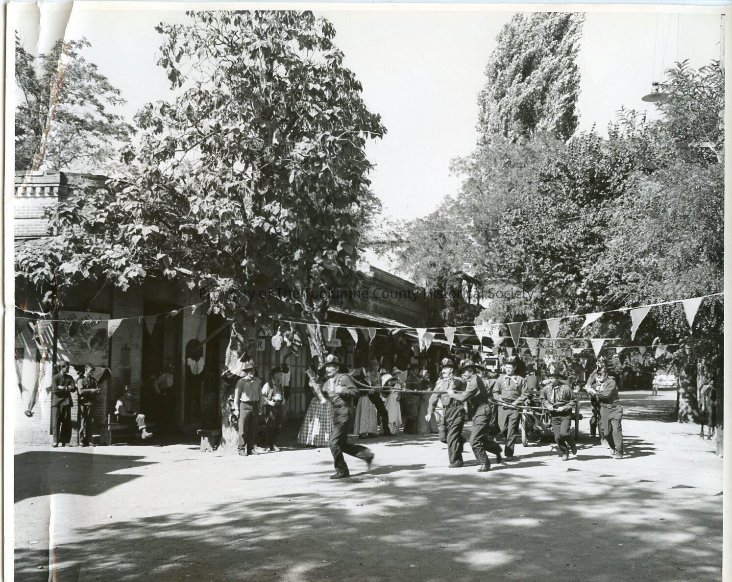 A 8" x 10" Black and white photo of the firemen muster in Columbia, Ca. Photo shows the firemen pulling the water pump and hose.