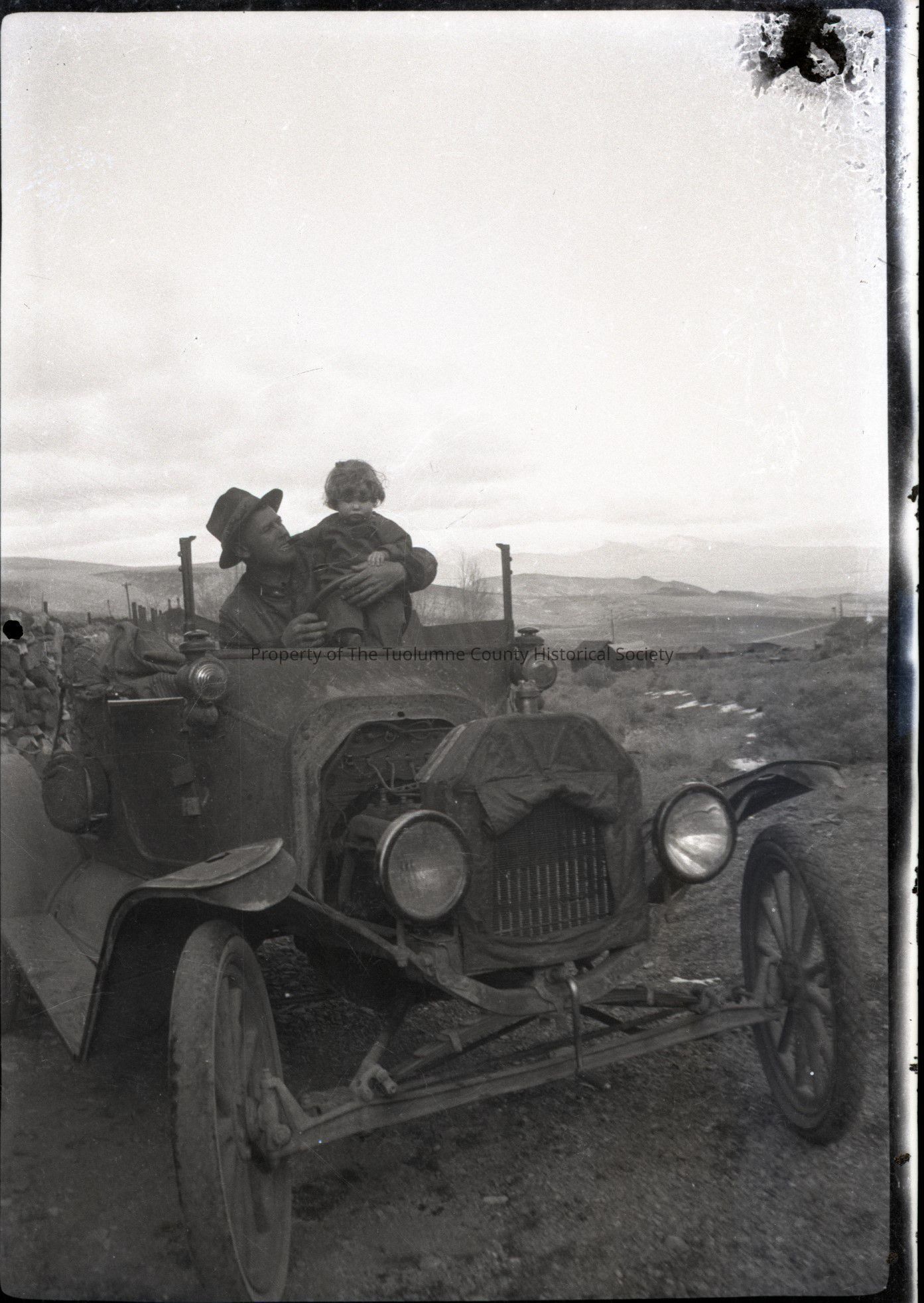 Black and white photo negative of an unidentified man and a small child in old-time Ford Pickup.