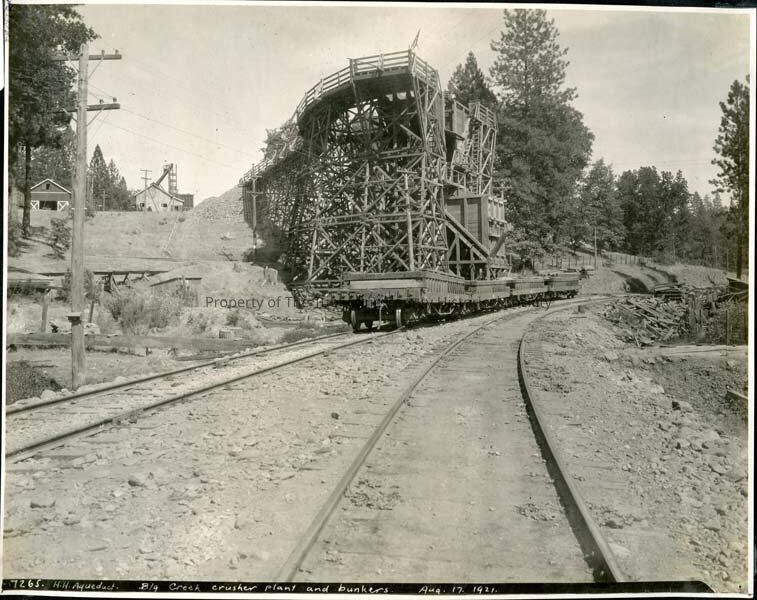 Crusher Plant, Hetch Hetchy, Bunker, Big Creek, Aqueduct, Hetch Hetchy, Big Creek, Crusher plant, Bunker, Econ/Indus, Utility/Hydro, Tuolumne County, Rail tracks with open cars, Barn, Power Poles, Aqueduct, Utility/Hydro.