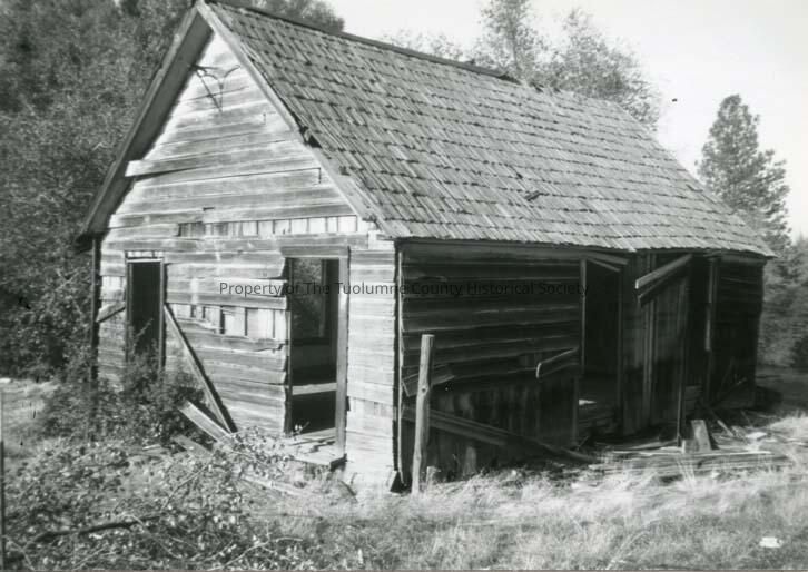 A black and white photo of the original Shaw's Flat School House on Shaws Flat Road, Sonora. Photo taken January 1991 Type: Paper