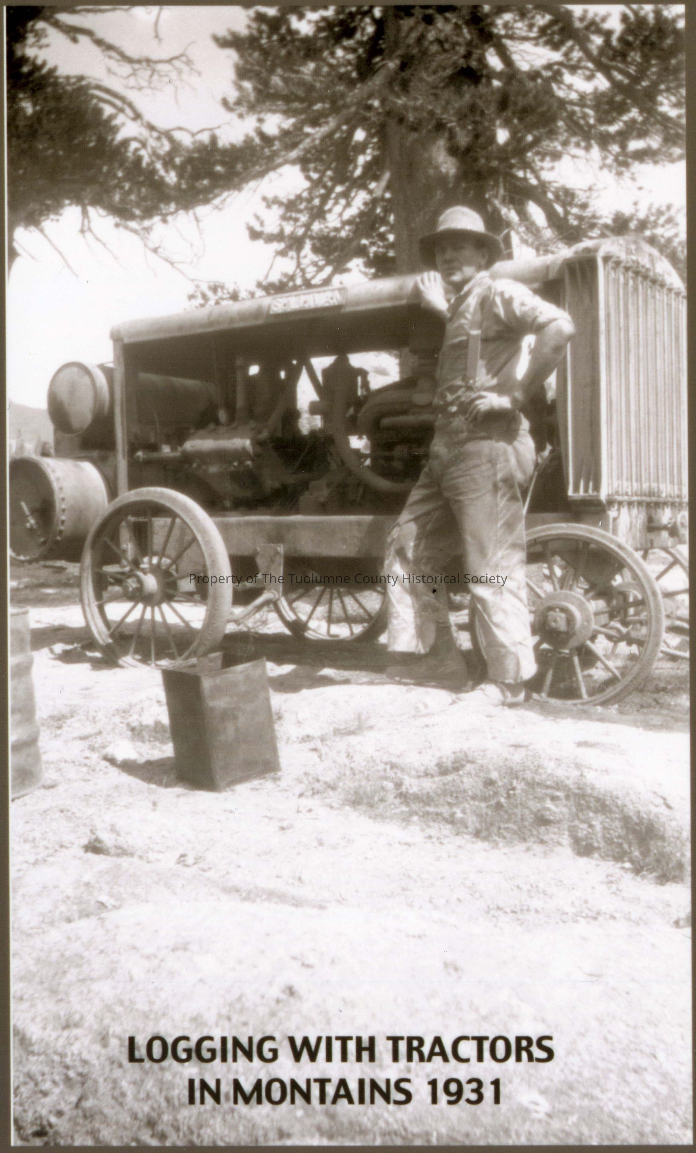 A black and white photo of an unidentified man standing by tractor. T tile of photo "Logging With Tractors In Mountains".Collection