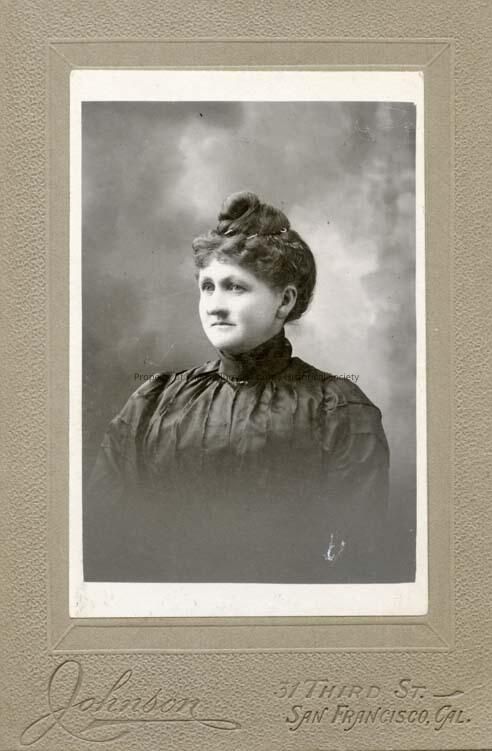 A black and white portrait of an unidentified woman with long dark hair worn on top with curl, dark color dress.