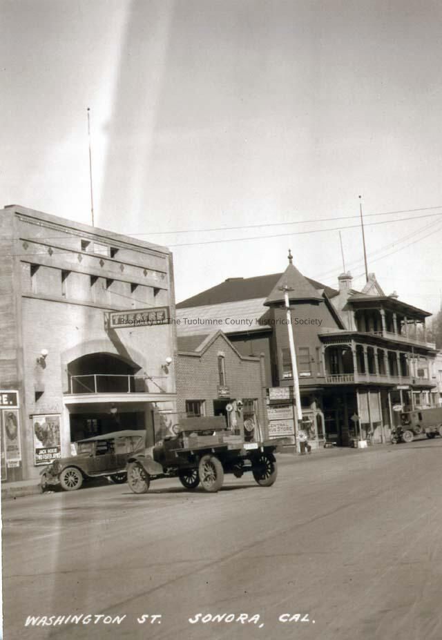 A black and white photo of Washington Street Sonora, looking west from Church Street. L-R Sonora Theater, Sonora Garage and Hotel Victoria. C1920s, Henry Ruoff photographerCollection