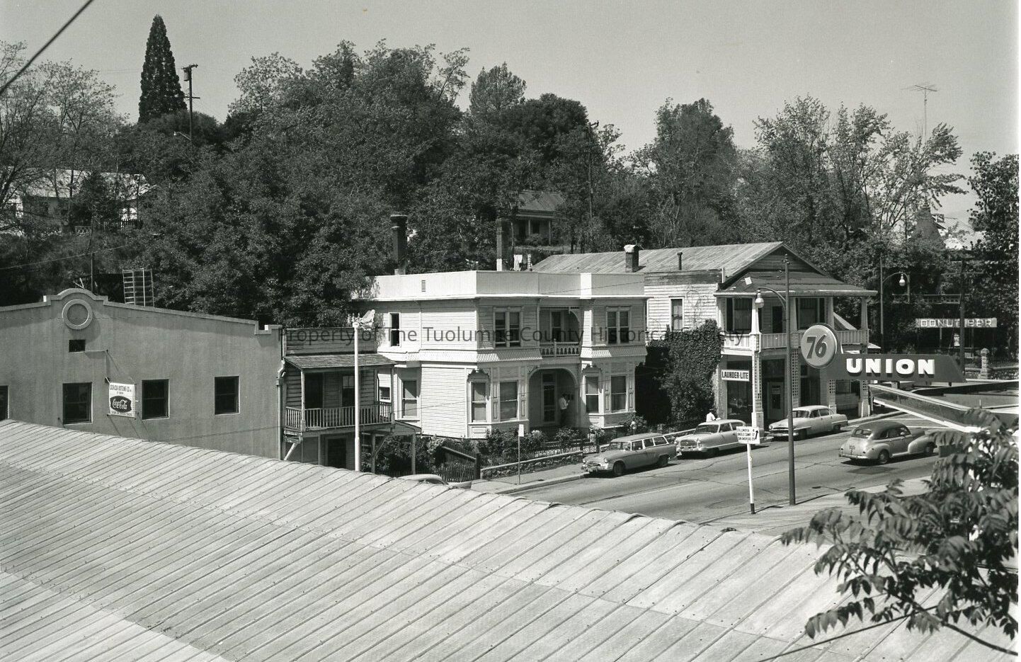 A black and white photo showing west side of North Washington Street with the Tezrich and Union 76.Collection