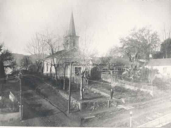 A black and white photo of the Sonora Methodist Church, built in 1852, torn down in 1922 and replaced. Church located on northwest corner of Yaney and Norling Streets.(2 copies) Type: Paper