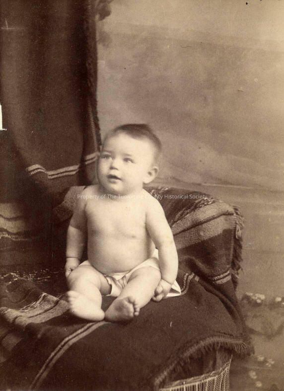 Unidentified infant, cabinet card, Bacigalupi family Album #4. he is pictured seated on a chair covered with a striped fringed blanket, the baby is wearing only a diaper. F.M. Harkness photographer.