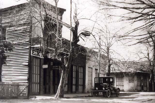 A black and white photo of the Wells Fargo Building in Columbia. An old 1900's Coupe on street. Stage Driver's Retreat Jack Douglass Saloon in background. Telegraph.