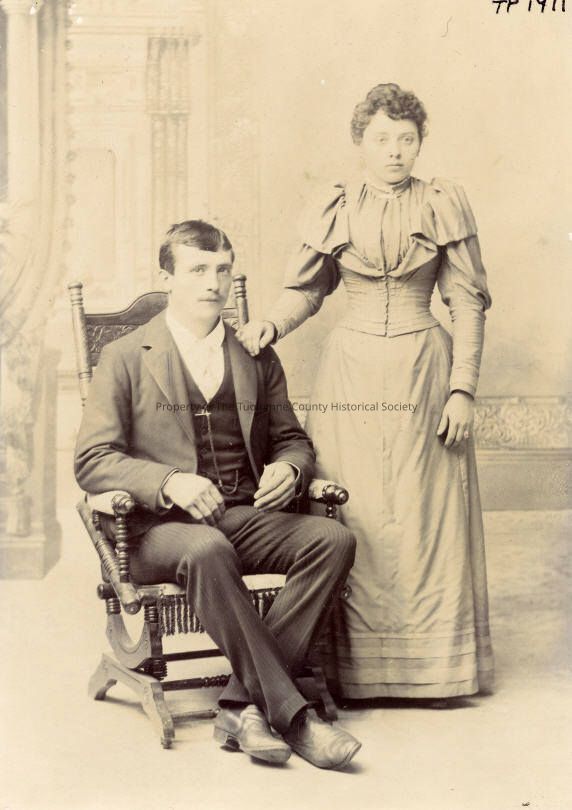 Unidentified man and woman, full length portrait, cabinet card, from Bacigalupi family album #4, the man is seated in glider/rocker with ankles crossed, he is wearing a dark medium lapel suit with darker vest, white shirt and tie, a watch chain is hanging from top vest button to lower vest pocket, wearing slip on shoes or boots, he is clean shaven with hair parted on the left and combed to the right. She is standing beside him with one hand on his shoulder, she is dressed in form fitted jacket/bodice with capelet sleeves over full upper sleeve that becomes fitted at the elbow. The bodice is worn over an under blouse gathered into a smooth neckband and with gathered fullness into the center buttoned bodice. Her skirt is fitted, floor length with tucks banded about the hem. it may have a bustle. Her hair is dressed in curls, drawn back behind her ears and into a chignon or bun in the back. This appears to be a wedding portrait.