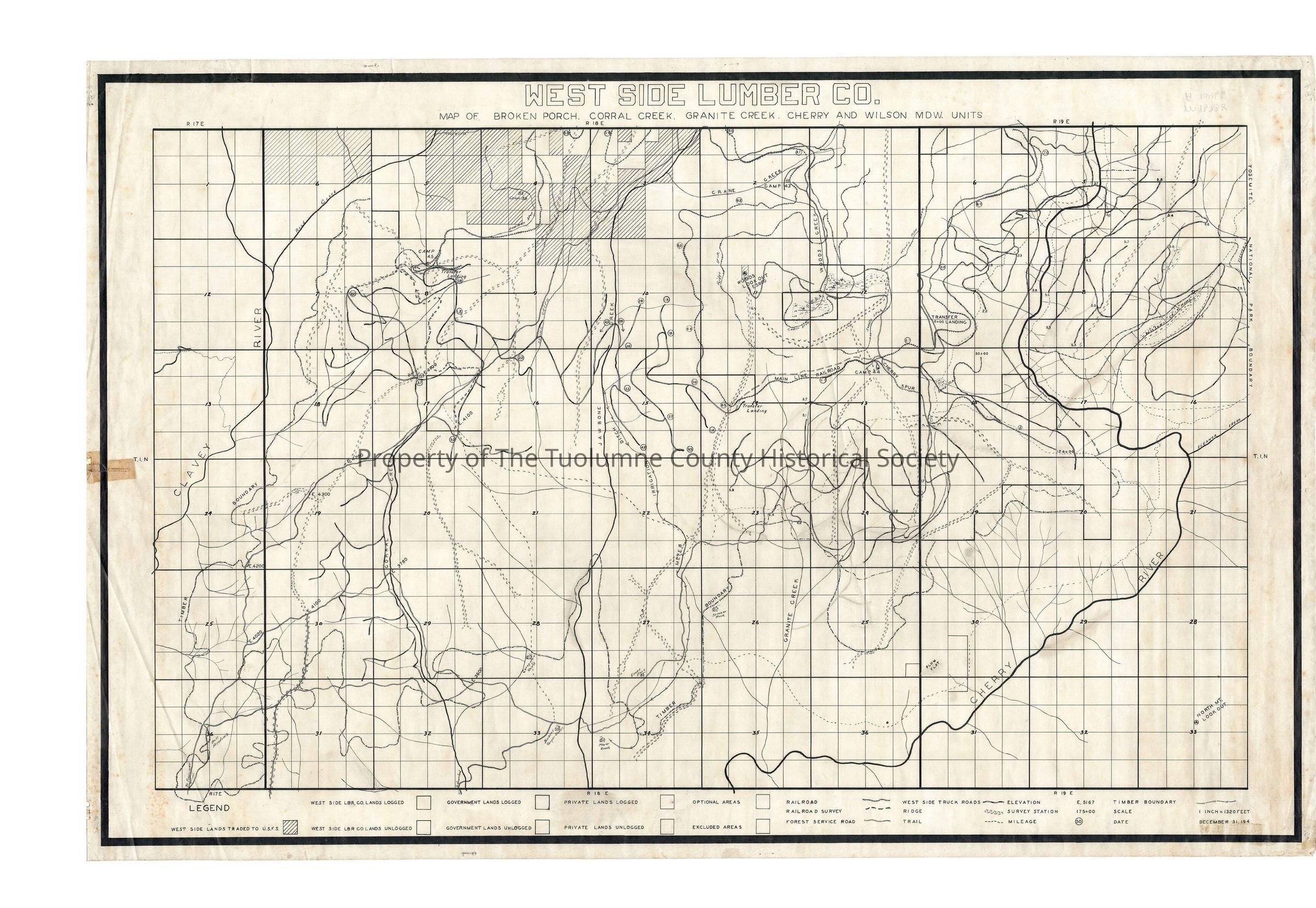 forest map, logging industry, ranching, West Side Lumber Co Railroad, Road to Groveland, Road to Tuolumne, Clavey River, Reed Creek, Corral Creek, Skunk Creek, Jawbone Creek, Meyer Irrigation Ditch, Granite Creek, Cherry River, Wilson Creek, Wilson Meadows, Woods Creek, Woods Meadows, Crane Creek, Transfer Landings, Cherry Spur, Deadman Spur, Ridge Spur, Broken Porch Cabin, Caraquero Ranch, Meyer Ranch, Evans Place, Speaker Place, Jawbone Ranger Station, West Side Lumber Co., Broken Porch, Corral Creek, Granite Creek, Cherry And Wilson Mdws. Units