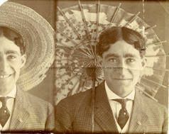 Portrait- Unidentified man. One and 1/2 photos - circa 1900 - 1915,photographer's proof, part of series, full shot shows man in dark suit coat, medium lapels, light colored vest, white shirt, spread collar, dark tie, he is clean shaven, full wavy hair parted in the center and combed to the sides, he is holding a patterned paper umbrella over his shoulder. The half picture shows the same man in a lighter colored suit coat with a different background, he is smiling in this version. Bacigalupi family album.