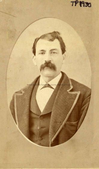 Unidentified man, portrait, Bacigalupi family album #4. Subject is pictured wearing wide lapel suit coat, the lapels are trimmed with light grograin ribbon. He has a shawl collared vest, white shirt with spread collar and ribbon tie. His hair is trimmed to touch the top of his ears, parted on the right and combed to the left. He has large, droopy unwaxed moustache. Sewell's photo