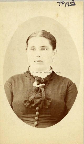 Portrait- Woman, not identified. Bacigalupi family Album #4. Circa 1860 - 1910, woman is dressed in dark clothing, with tight fitting bodice that buttons center front. The sleeves are smooth and slightly below natural shoulder. She has white lace at the neckline and a dark lace jabot tied around the collar area. A round locket is visible as well as a brooch closure and her hair is pulled back severely and dressed in the back off her neck.