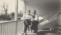 A black and white photo of an unidentified man and Woman sitting on porch. Possibly Hi Pruett and friend. No information available on photo.