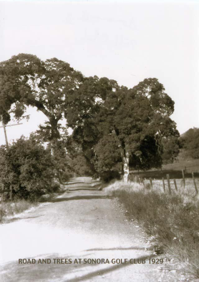 A black and white photo of road and trees at Sonora Golf Club 1929.