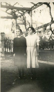 A black and white photo postcard of 2 ladies under grape arbor, not identified. Possibly family of Bacigalupi's. Type: Paper