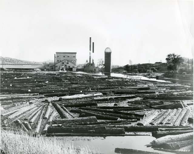 A photo of the mill pond looking toward the mouth of the mill with a power washer cleaning the logs of stones and debris before entering the mill to be sawn. The wood chip and sawdust burner silo and the chimneys of the steamer are to the right of the mill.