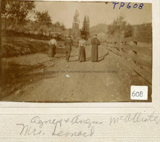 AGNES AND ANGUS MCALLISTER AND MRS. LEONARD - 3 women and 1 man walk down a dirt road at an unknown location. Photo taken from behind them.