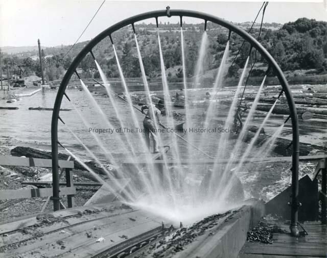 Workers guide the logs to be processed up the ramp where they go through the washing process to remove stones, etc. from the bark of the tree before they are sawn.Collection