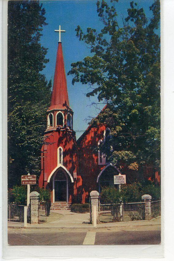A color photo postcard of the St. James Episcopal Church in Sonora, CA. The church is also known as the "Red Church."