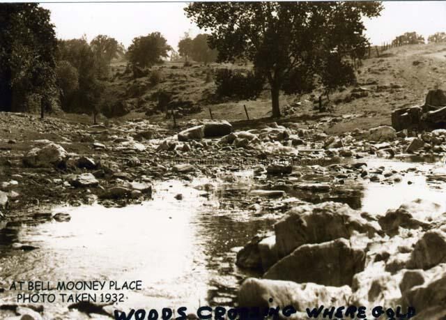A black and white photo of Woods Crossing at Bell Mooney Place where gold was first discovered in Tuolomne County in 1849. Photo taken 1932.