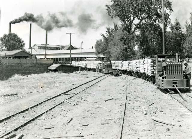 Two mule trains loaded with lumber, either arriving at the drying sheds or having been cured, are on their way to the loading docks for shipping. The mule or shunt engines are made by Plymouth.