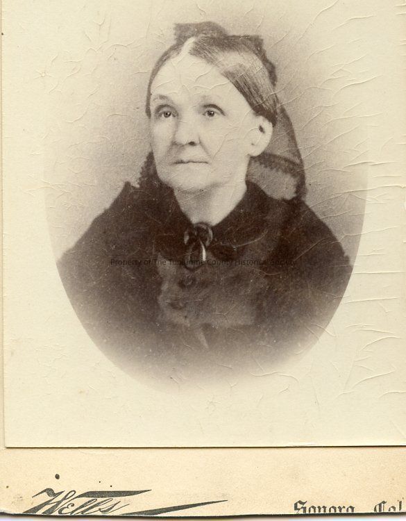 A black and white portrait of an unidentified older lady. Wearing dark color dress with pin at neck . Hair has middle part and scarf in back.
