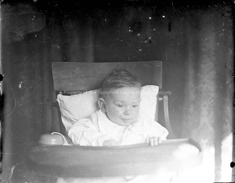 Glass Negative of an unidentified young baby sitting in a high chair. Has a pillow in back.