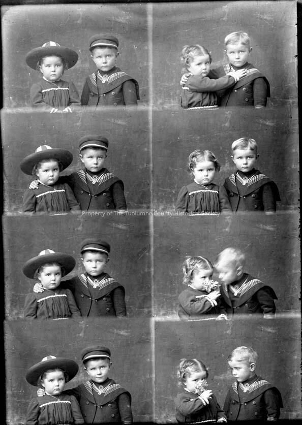 Glass Negative with eight (8) small photos showing small unidentified young boy and girl. Four (4) photos show both wearing hats and four (4) show them without hats