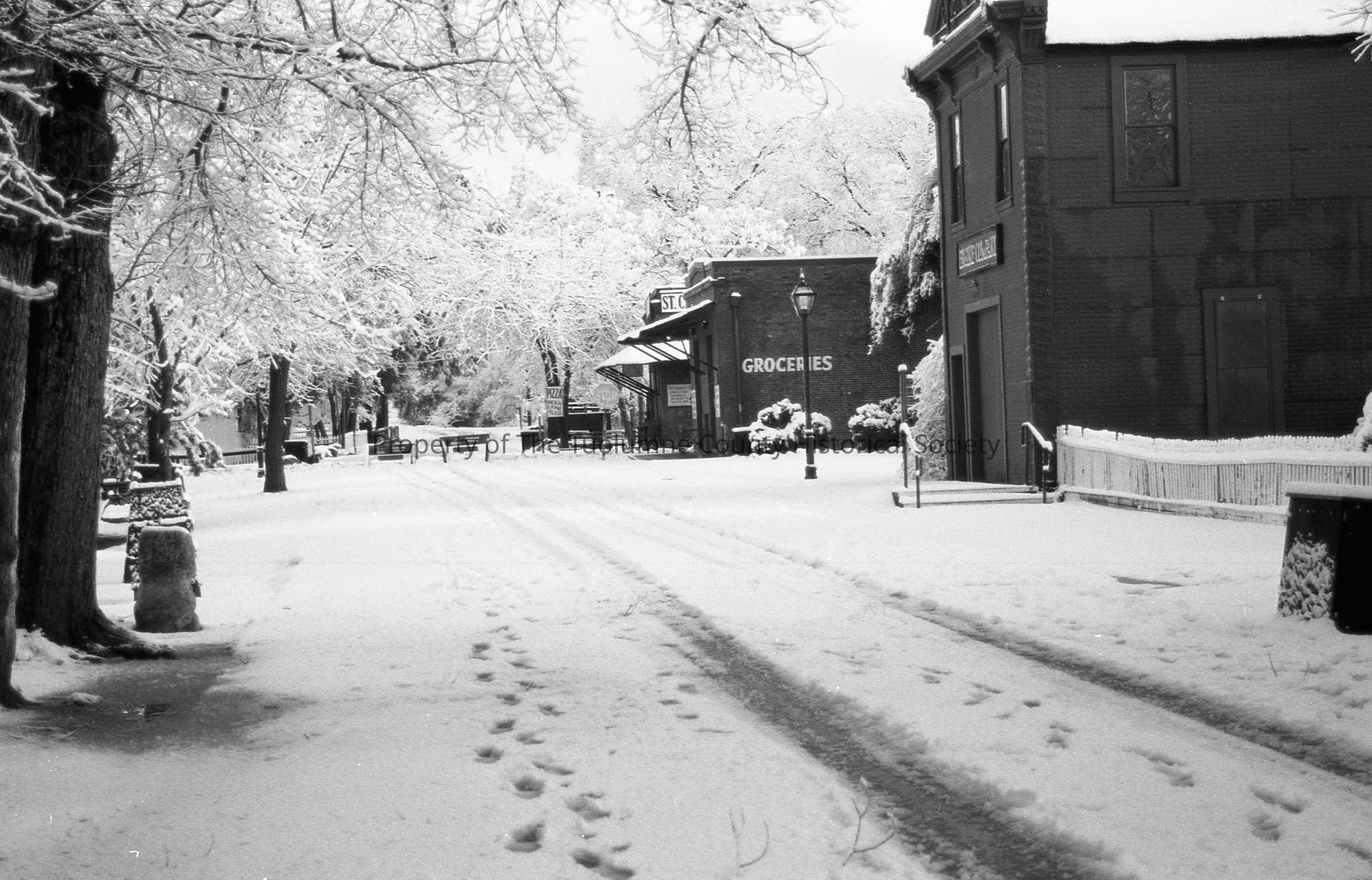 Main St. in snow looking north toward Columbia Mercantile Store and the museum.