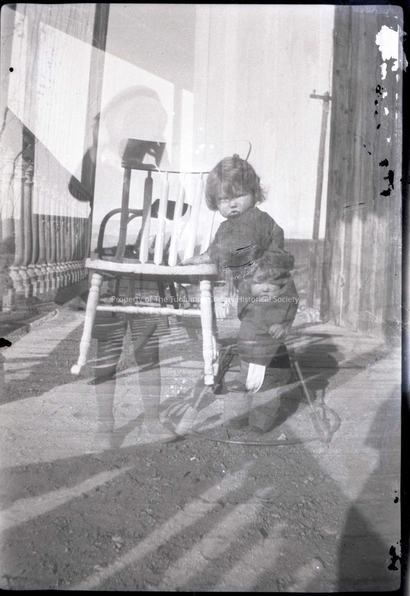 Black and white photo negative of a small child in a walker and holding onto a rocking chair. The photo is double exposed.