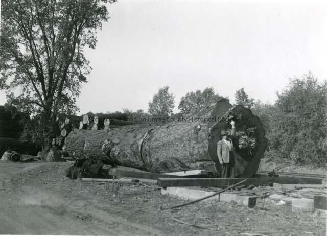 Emphasizing the girth of a log at the Standard Lumber yard, Jack Rassenfoss (President) stands with his hand in the air, which would make the girth around 10 feet.Collection