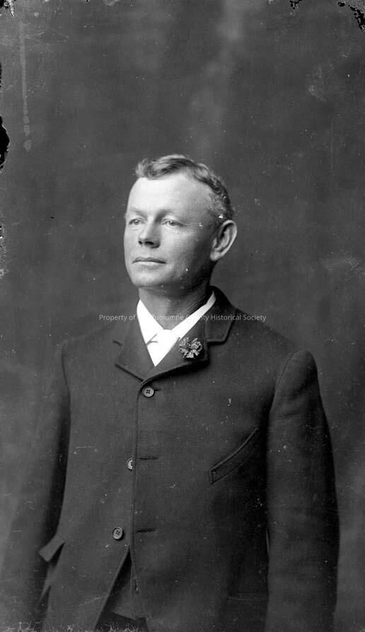 Glass Negative showing a man in suit buttoned up with three buttons and a flower on the lapel