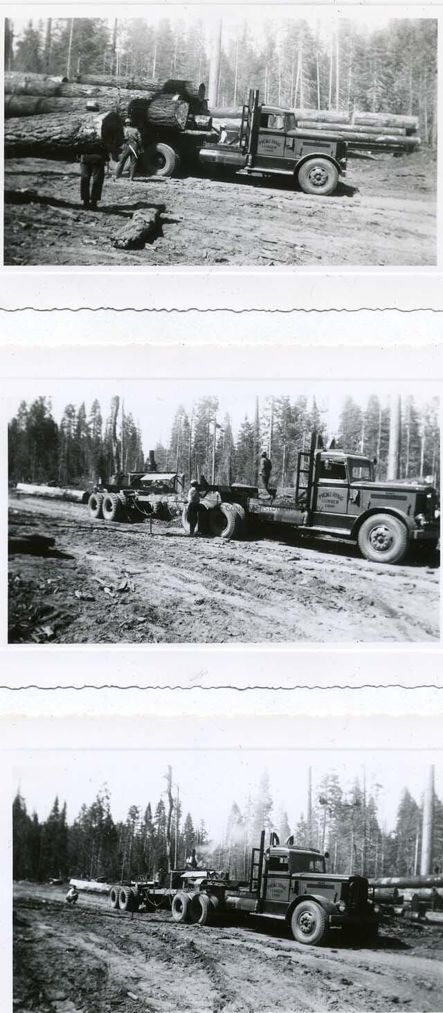 A series of three photos showing a truck of the Pickering Lumber Co. transferring log to rail cars. This is a Peterbilt Model 354DT, number 101. Paint is Utility orange and Black per the Peterbilt specification sheet.Collection