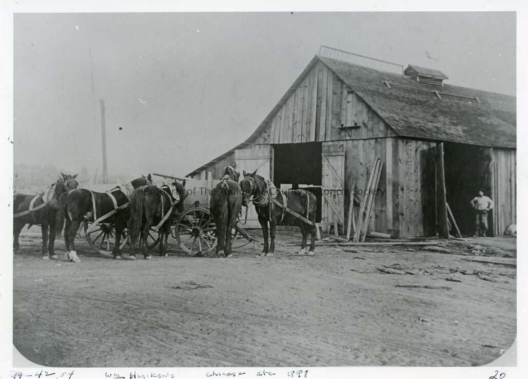 A black and white photo of the blacksmith shop owned by William Hiniker at Chinese Station. Several horses and wagon in front of building. 1898. Type: Paper