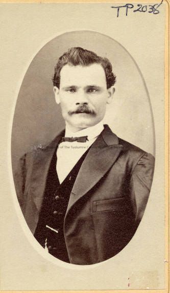 Portrait- Man. Middle age. Wearing a dark suit with a vest and bow tie. Has a watch chain in the vest. With a moustache. Type: Paper