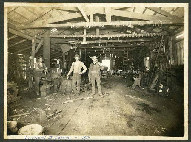 Sepia toned and mounted on cardboard, 6 1/2" x 8 3/4" print, showing the interior of a blacksmith shop, and three men standing for a pose. Leonard J. LePape is pictured on the left with foot resting on anvil and hammer in hand. 1914.Collection