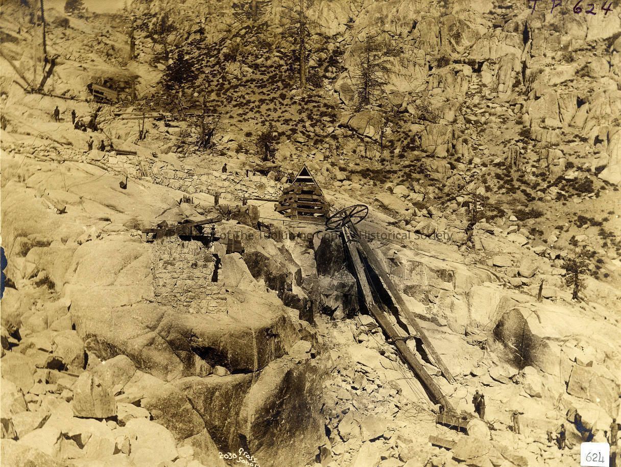 Construction of relief dam - Equipment and structures are seen in the background. Several unidentified men can be seen in the foreground.