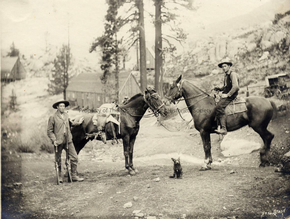 Landscape- At the Relief Dam site. 2 men out hunting with horses and bagged a deer. Outside the camp site.