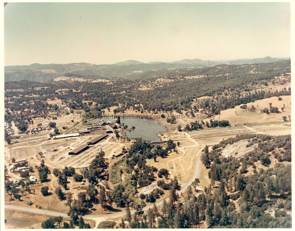 Color photo. Aerial of West side pond and mill and empty lot and surrounding hills.
