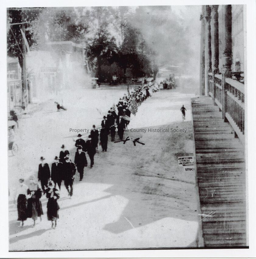 World War 1 victory parade on Washington Street, November 11, 1918, taken from veranda of Hotel Victoria. (Per Doris McCormick as told to Pat Perry, the arrow marks where Bert Rehm and his stepson, Frank McCormick are in the parade). Note people wearing masks because of the influenza epidemic.Collection