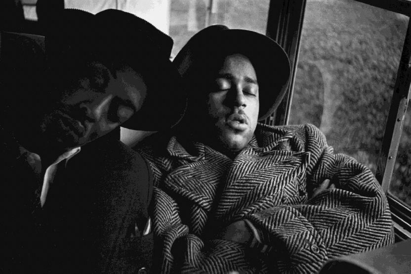 Danny Barker and Dizzie Gillespie, on the road with Cab, train c. 1940Description