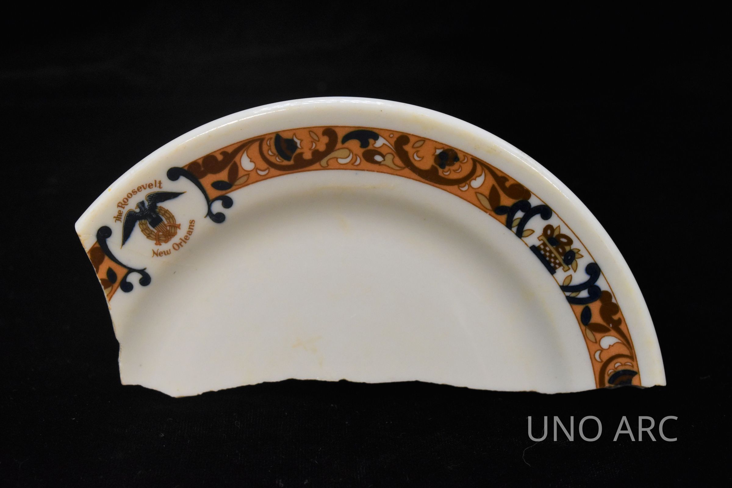 Ceramic hotelware from the Roosevelt New Orleans. The pattern from this plate sherd matches the pattern from another vessel sherd in this collection.Created By