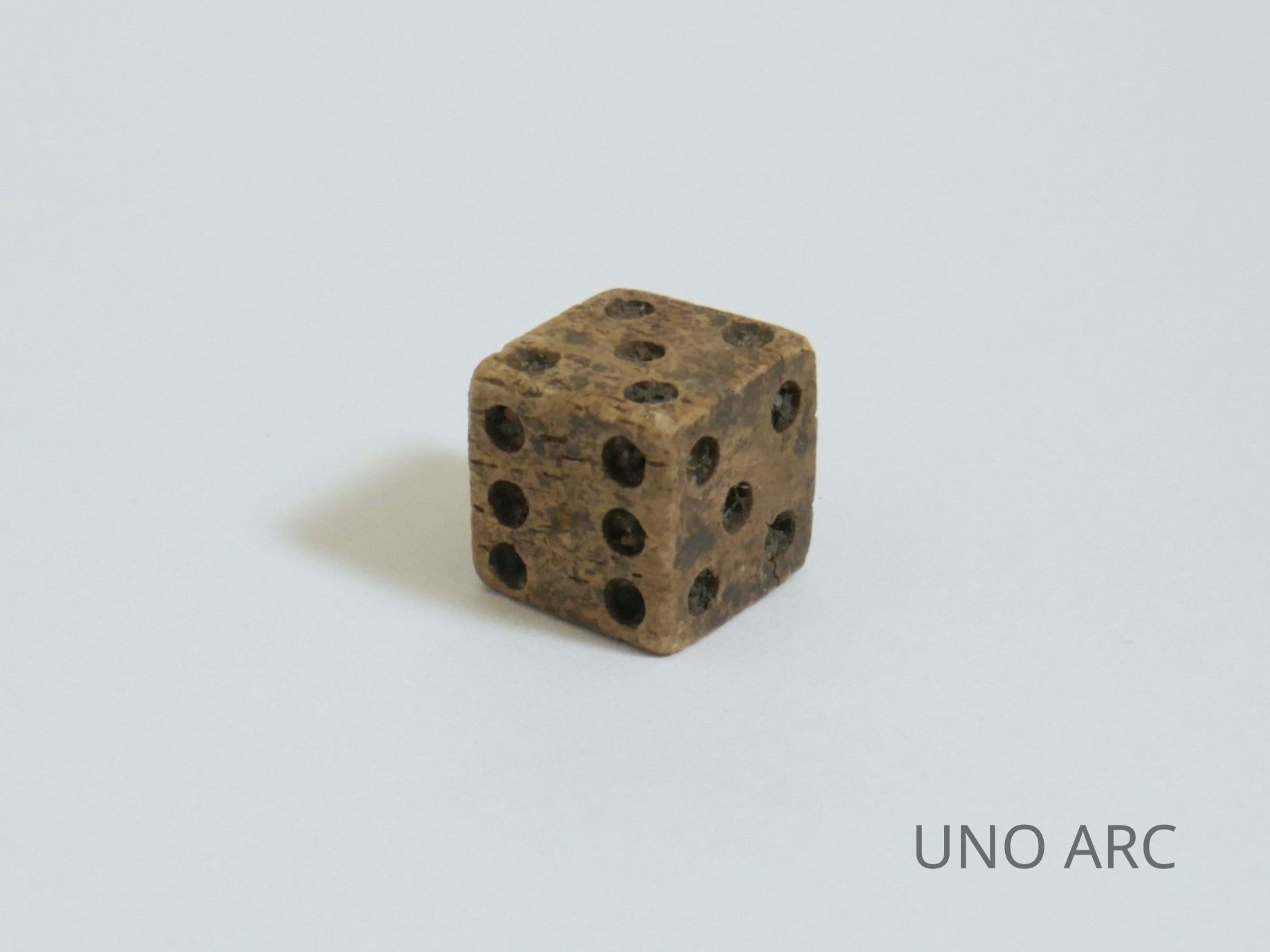 Animal bone "trick die" with four sides of 5, one side of 1, and one side of 6Context