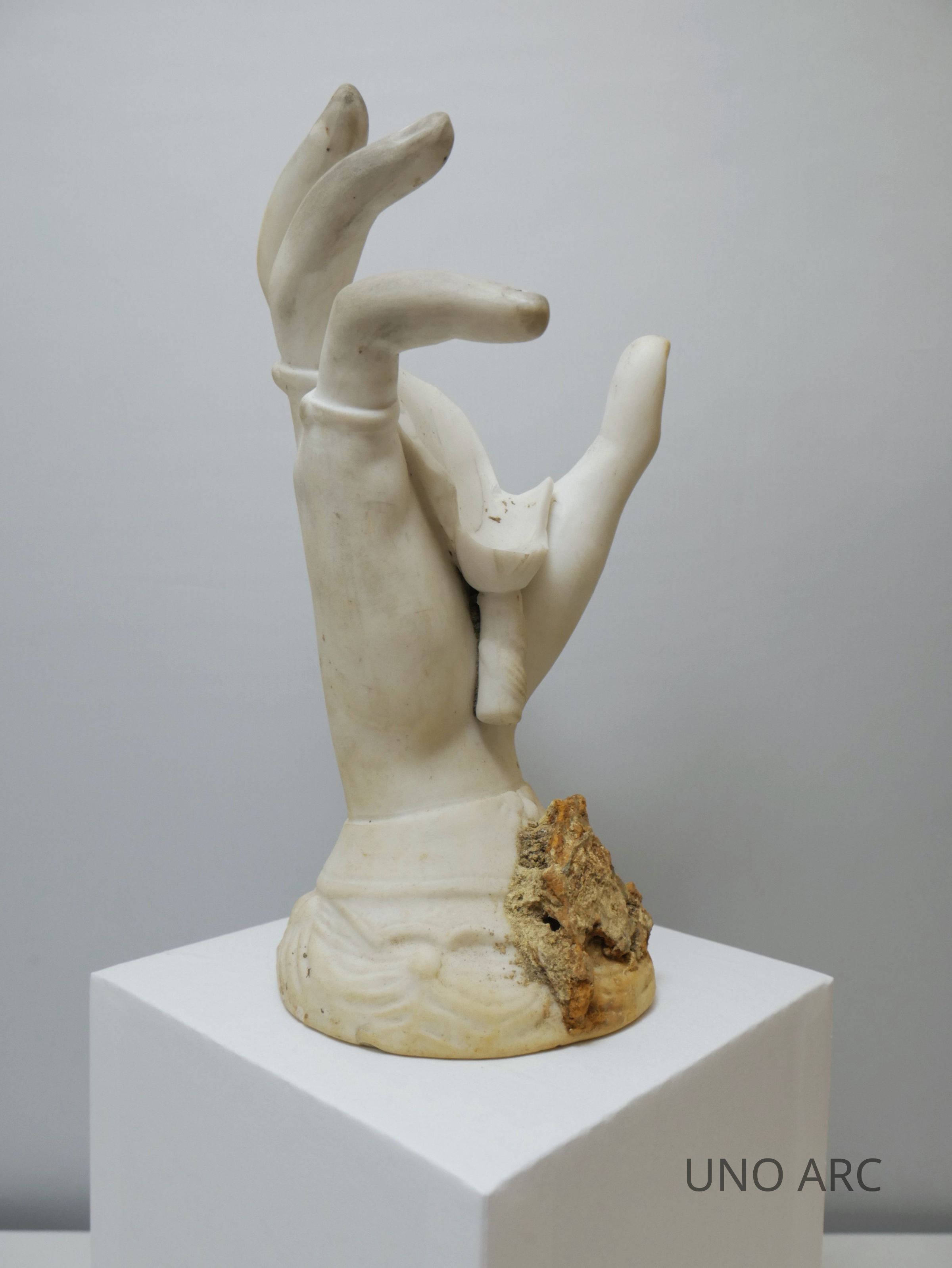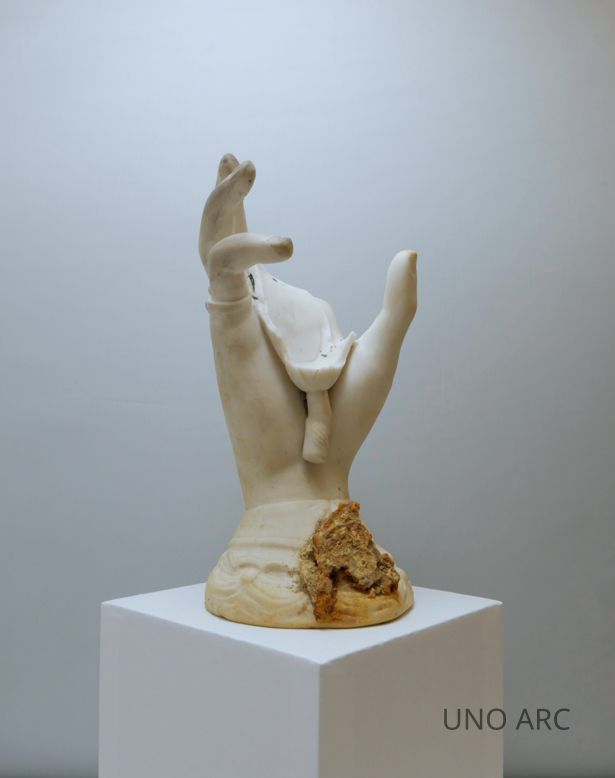 Bisque porcelain jewelry holder. Missing index finger.Context