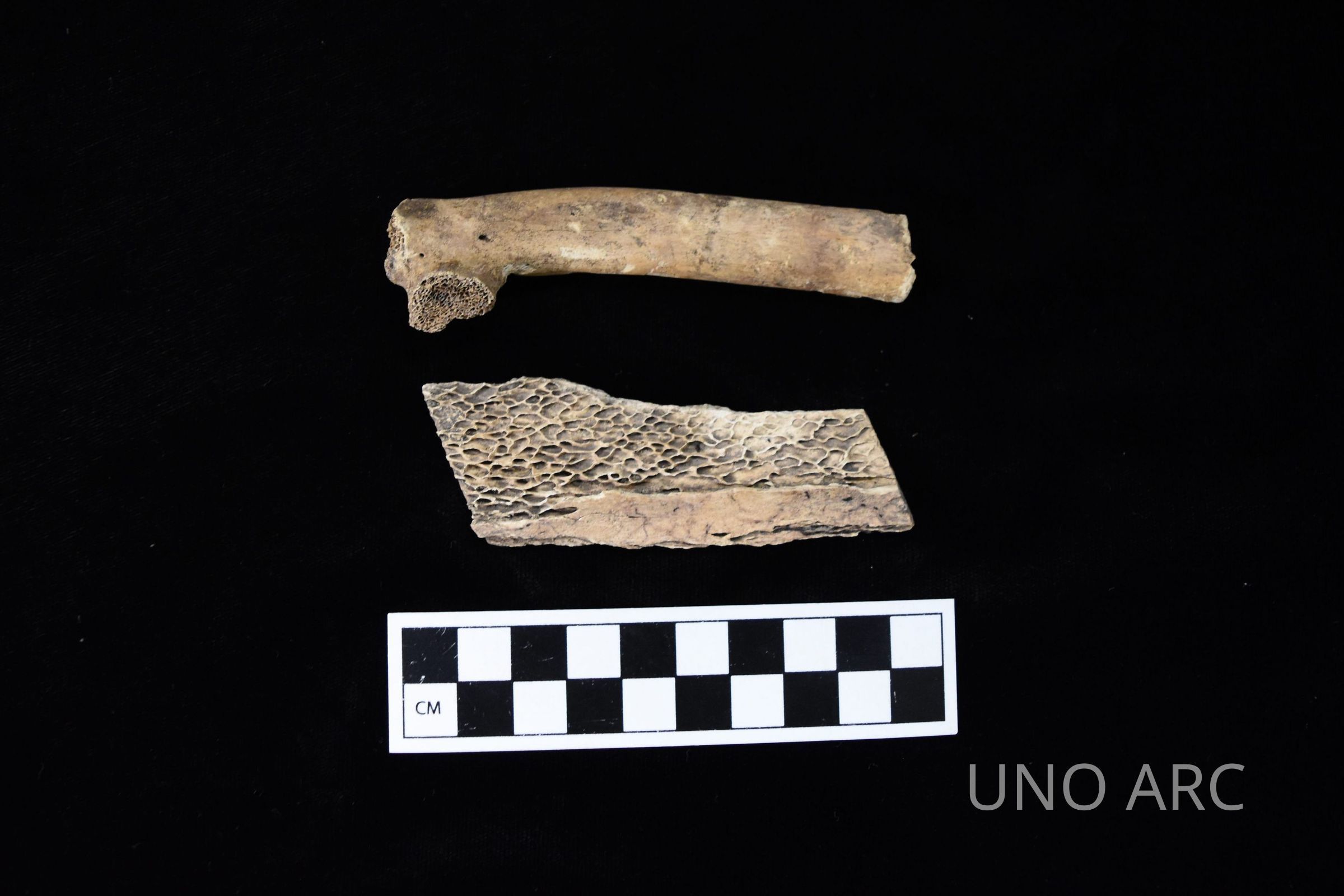 Two bovine bone fragments. One has broken in half, exposing its porous inside.Context
