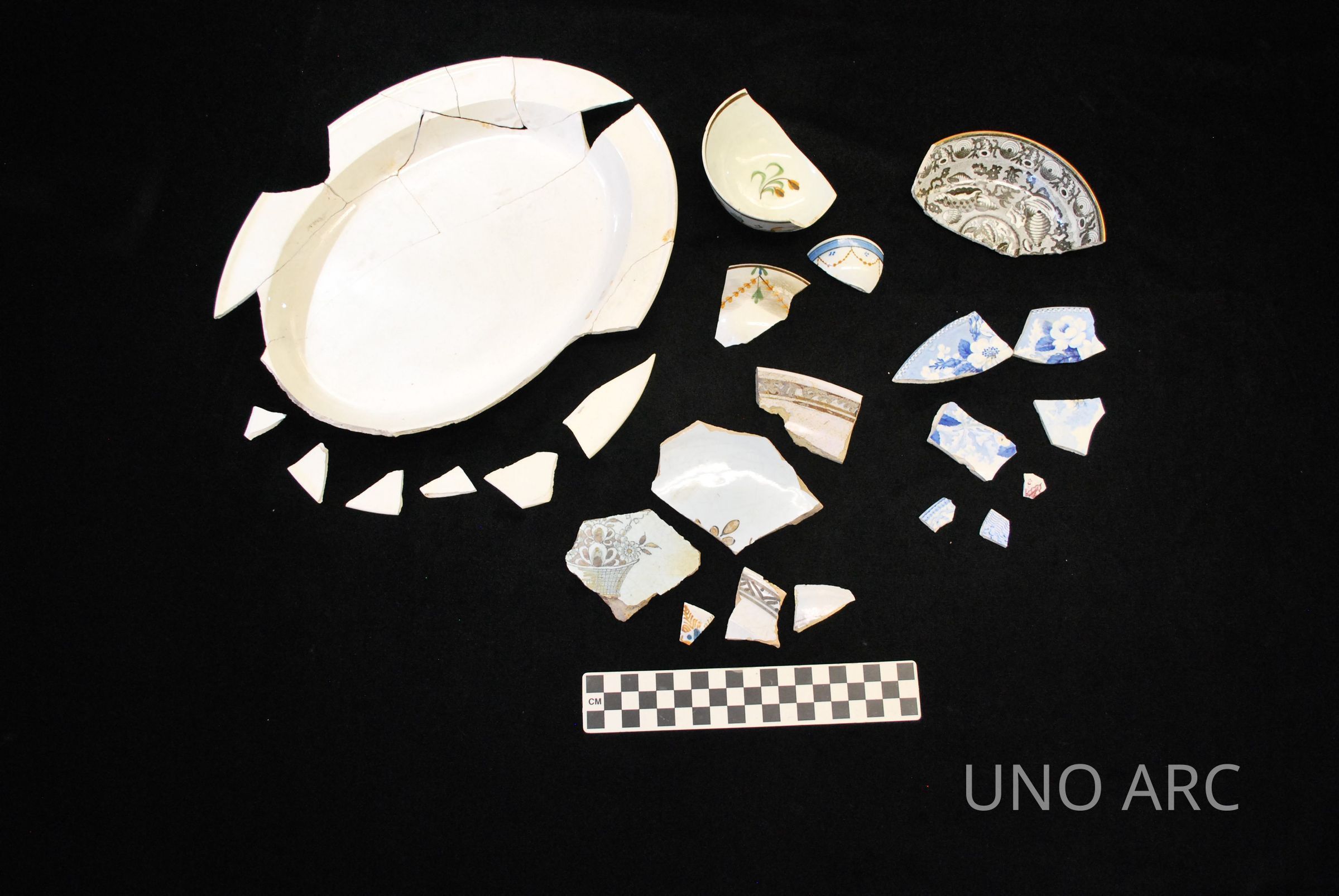 The ceramic assemblage included fragments of creamware, faience, pearlware, and whiteware vessels. The wide range of manufacture dates suggest that there were two mixed deposits, one from the early nineteenth century and the other from the mid-nineteenth.Created By