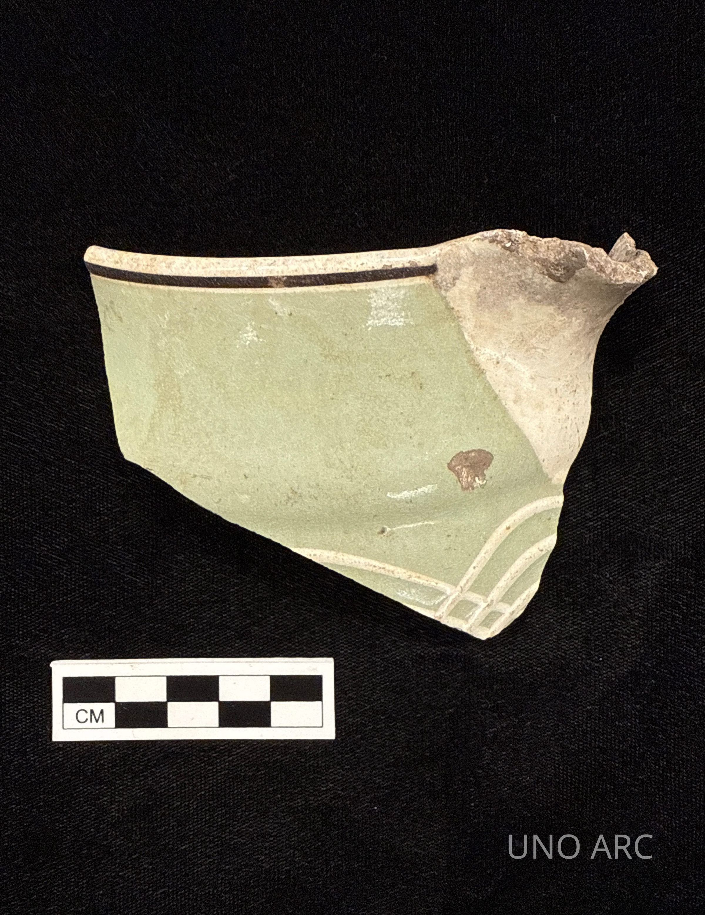 Whiteware Pitcher; Green and Black Annular; Complex White Slip TrailContext