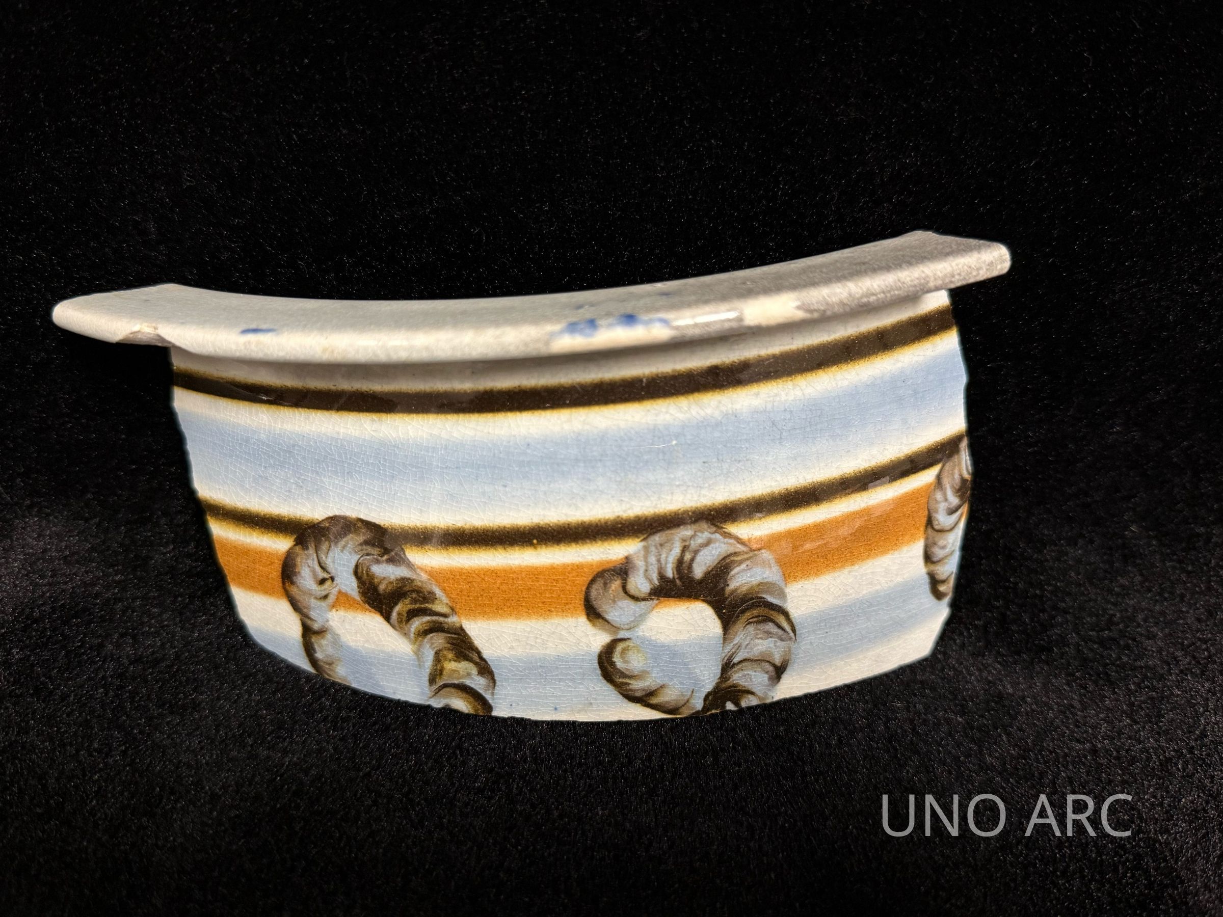 Pearlware Chamber Pot with a Decorative Handle; Polychrome Annular with Worm Trailed DecorationContext