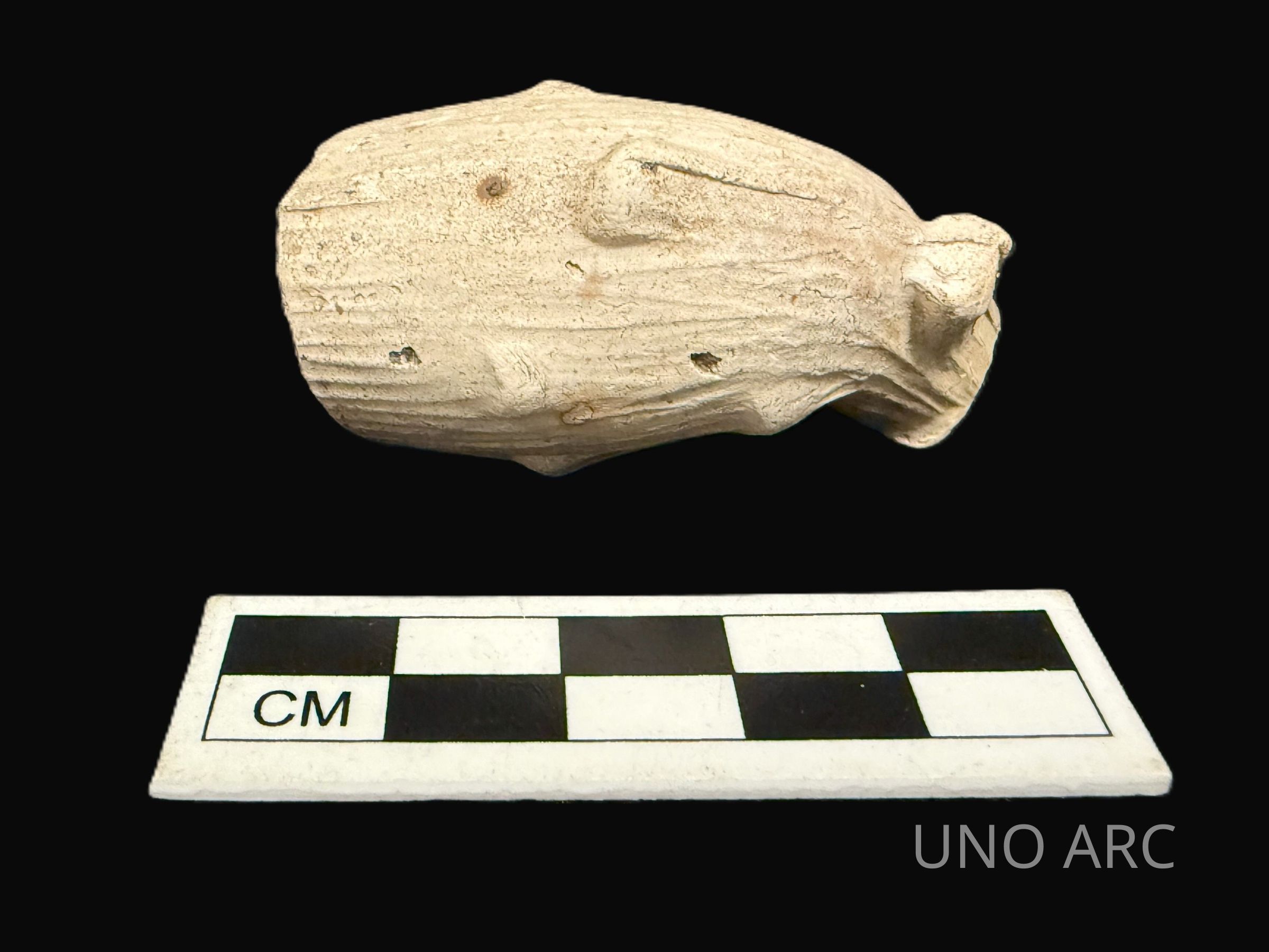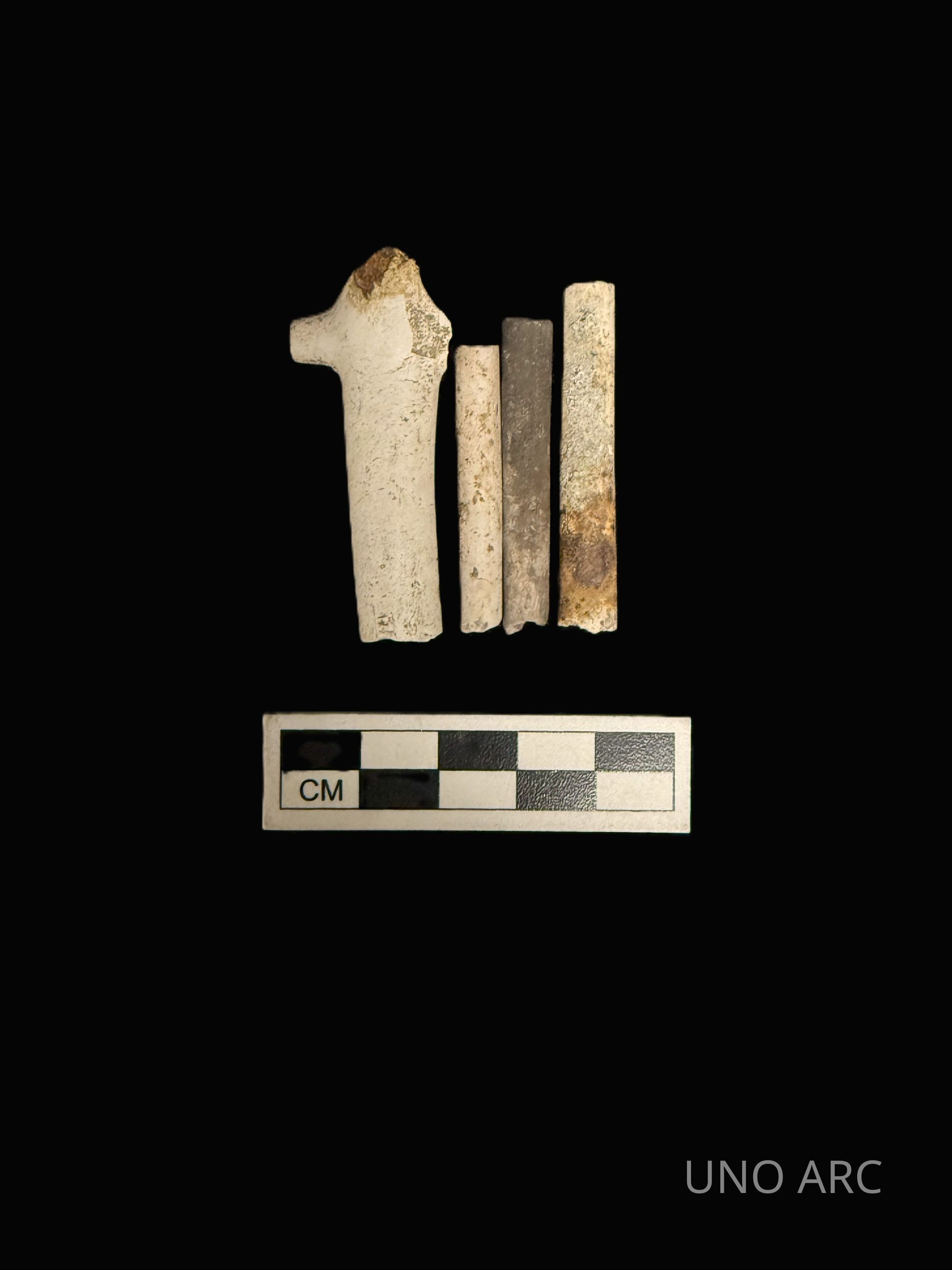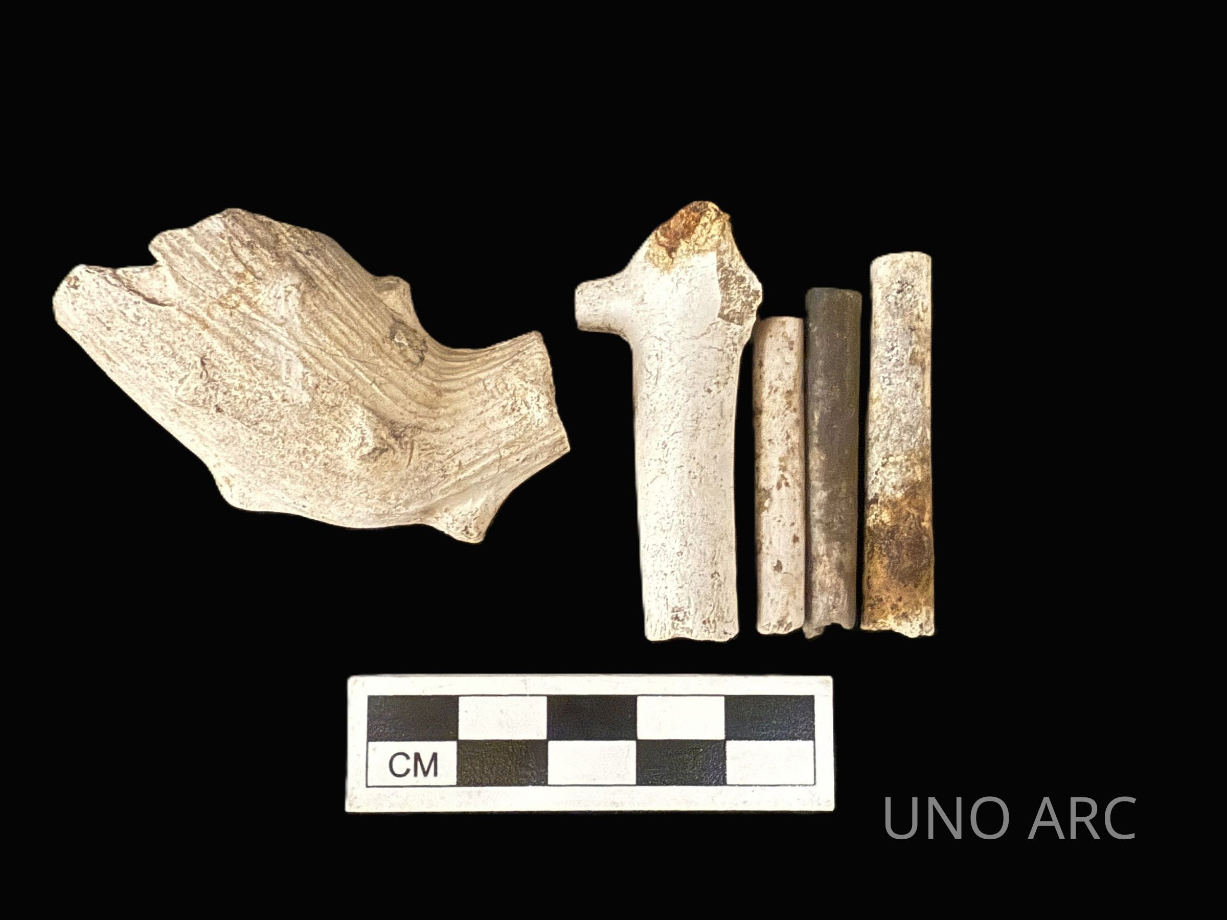 White clay ball pipe bowl, stem and base of bowl, and three pipe stems; Ornate decoration, wood/naturalContext