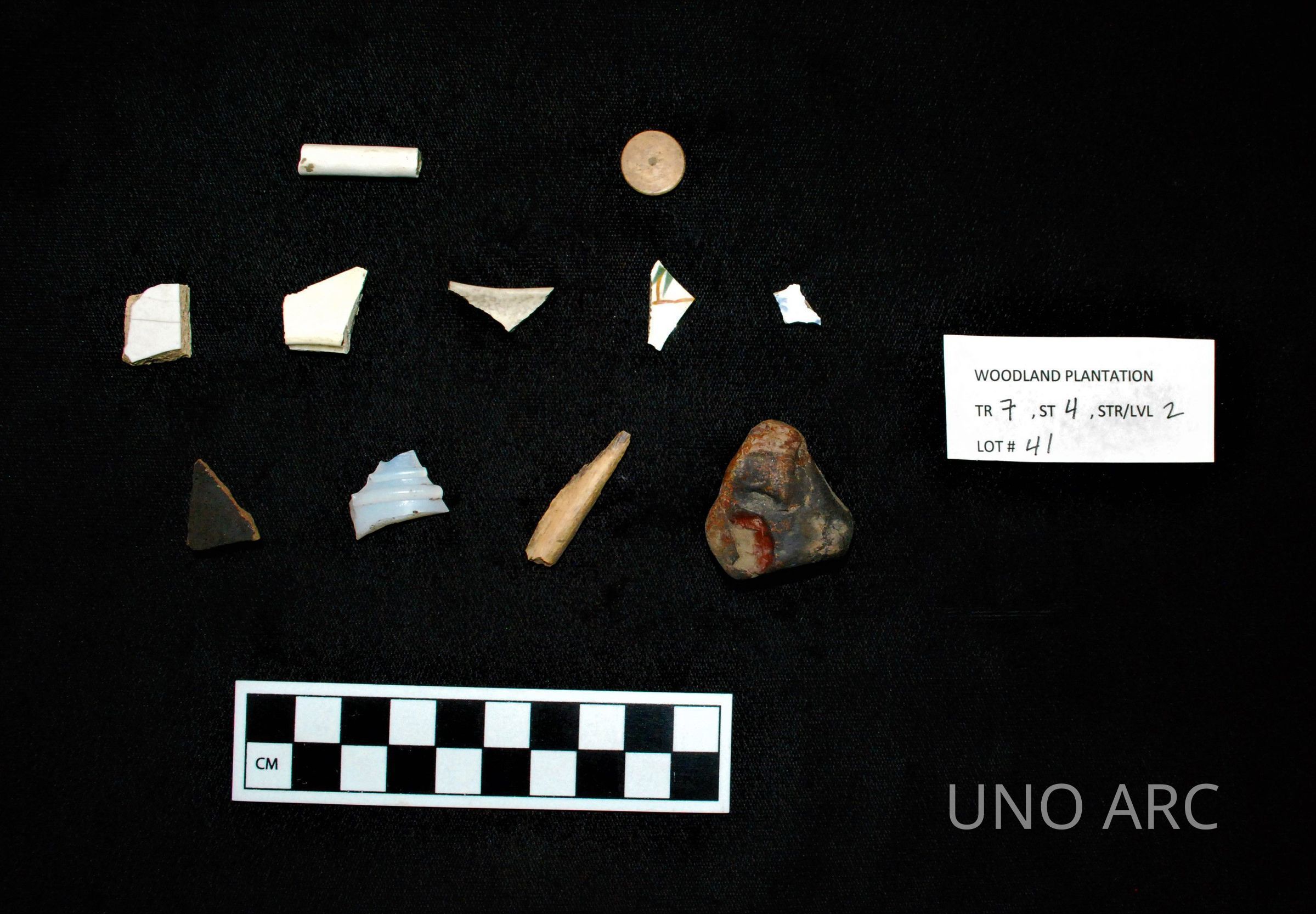 Collection of artifacts, including pipe stem, bone button disk, ceramics, glass, animal bone, and fire-cracked rockContext